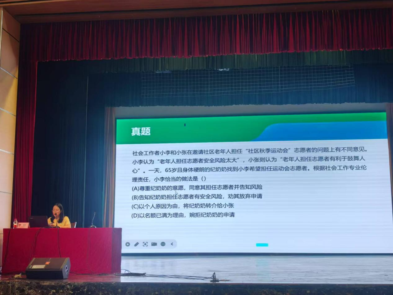 5月,社会工作系教师团队全面参与社会工作者职业资格考前培训工作。文丽老师及兼课教师黄燕春为由区党委社会工作部举办、广西社会工作协会承办的广西2025年度社会工作者职业资格考试(百色、玉林场)考前培训班授课;李瑜、蓝咏石等教师为南宁市各县区考生开展考前辅导培训,该培训由南宁市委社会工作部举办、南宁市社会工作协会承办。系列课程累计服务考生逾1800人次,助力提升全区持证社工比例。
