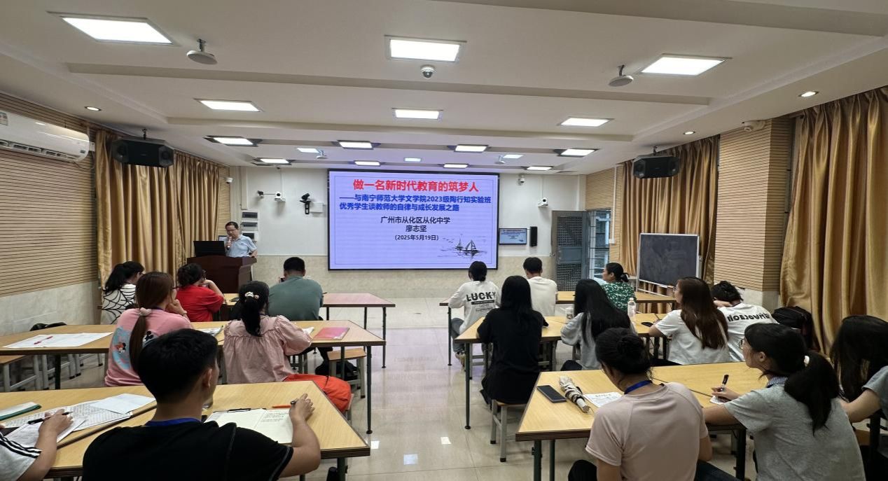 下午,从化中学党委书记廖志坚为见习生开展了“做一名新时代教育的筑梦人——与beat365平台官方网站文学院2023级陶行知实验班优秀学生谈教师的自律与成长发展之路”的专题讲座。