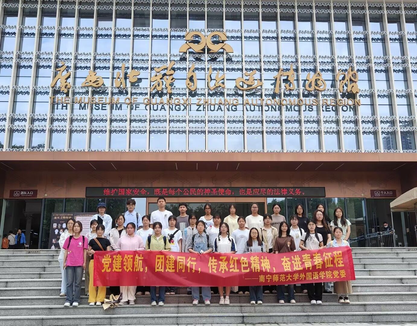 为了提高入党积极分子的党性修养,增强对党的事业的认同感与使命感,激励他们将文化自信转化为行动自觉,投身于新时代中国特色社会主义建设。5月17日,外国语学院党务助理团队带领第66期入党积极分子前往广西壮族自治区博物馆参加以“红心映壮乡,文化共传承”为主题的实践活动。
