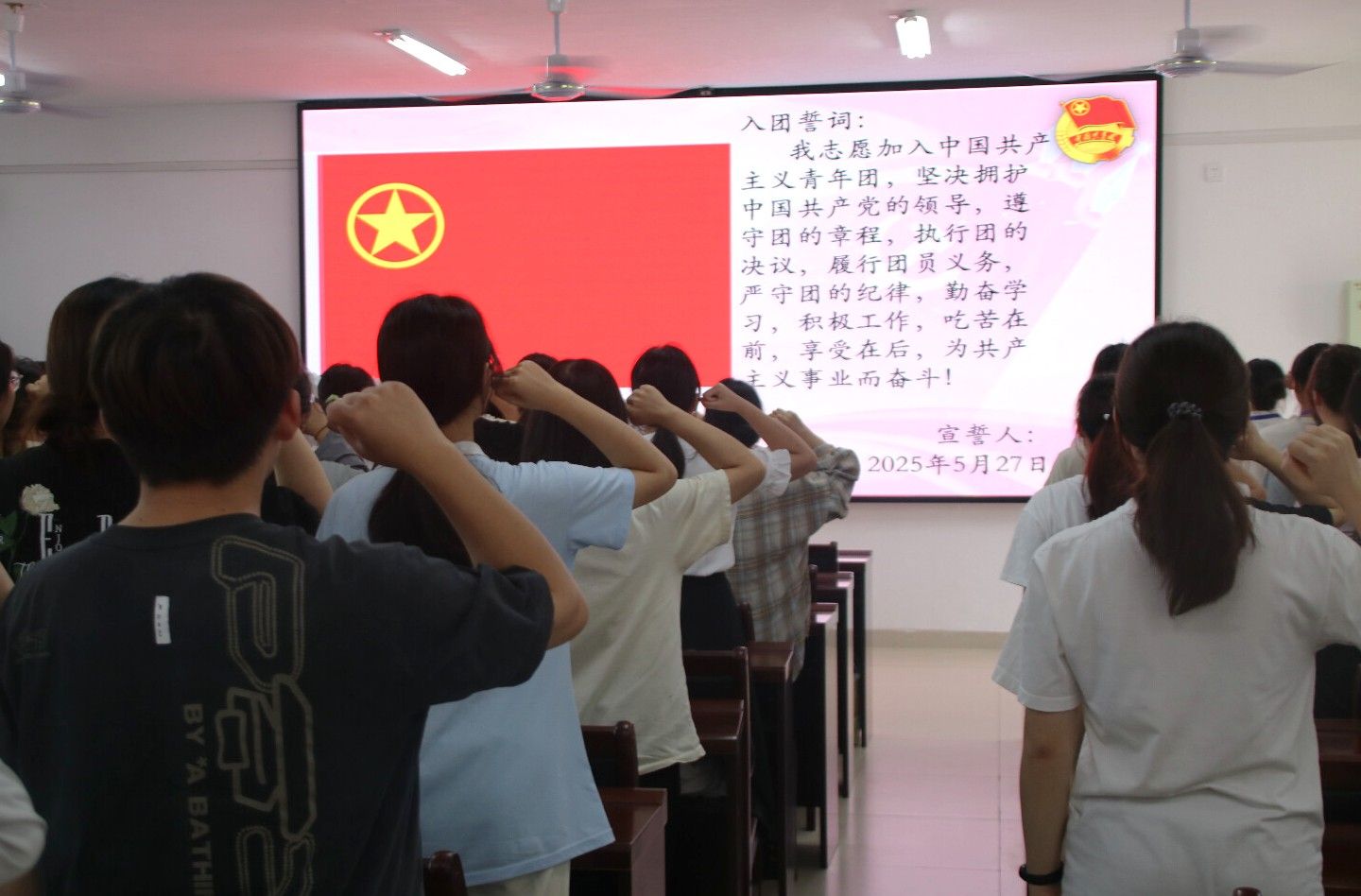 最后,全体起立奏唱团歌,入团仪式圆满结束。此次入团仪式为外国语学院共青团注入了新鲜血液。未来,新团员们将以入团誓词为指引,在学习和生活中展现共青团员的担当,为实现中国梦贡献青春力量。