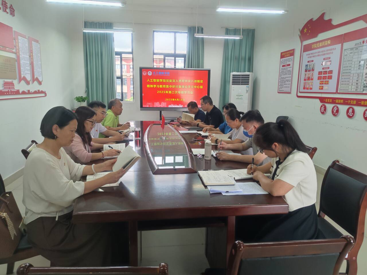 6月10日下午,人工智能学院党委在地信楼A302党员活动室召开深入贯彻中央八项规定精神学习教育集中研讨暨学院党委理论学习中心组2025年第二次专题学习会,学院党委理论学习中心组成员参加会议,组织员和纪委委员列席会议,学院党委副书记(主持党委工作)黄江涛主持会议。