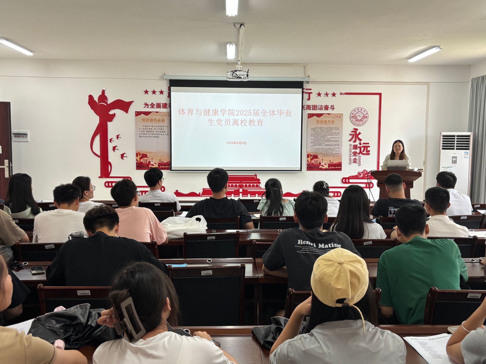 为推进毕业班党员深化落实中央八项规定精神,强化毕业生党员身份意识和责任担当,确保毕业生党员组织关系转接工作顺利完成,6月6日,体育与健康学院在学院B314会议室开展2025届全体毕业生党员离校教育会议。学院党委书记磨有积、党委副书记陈军弟,学院全体2025届毕业生党员参会。会议由学院团委书记农梦莲主持。