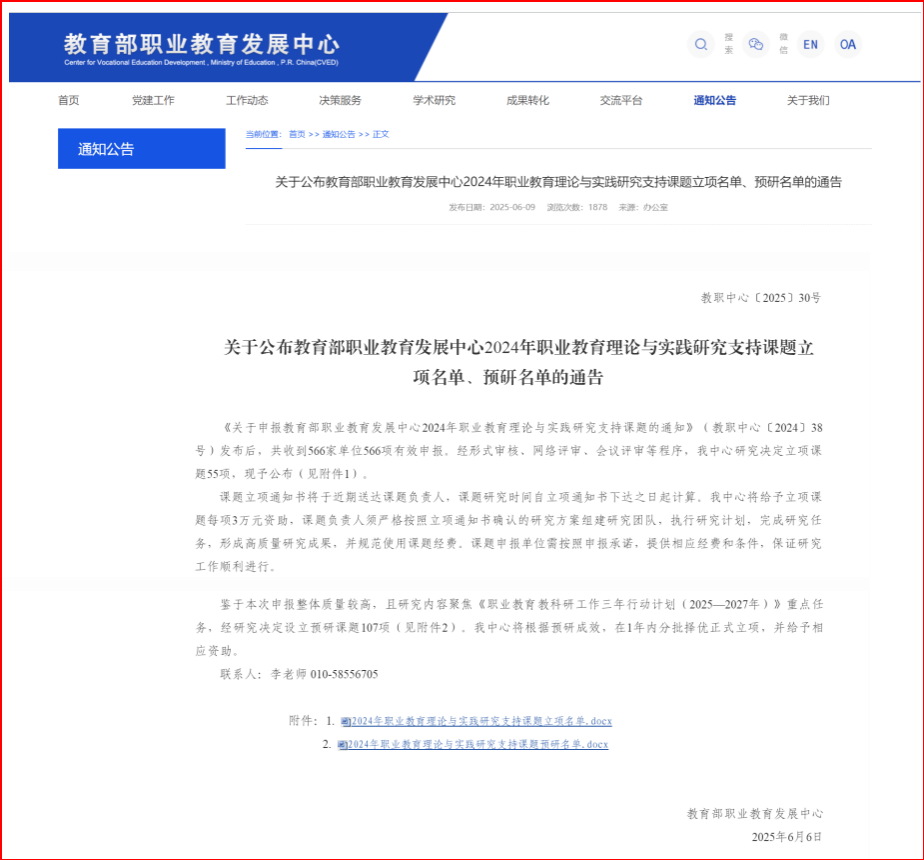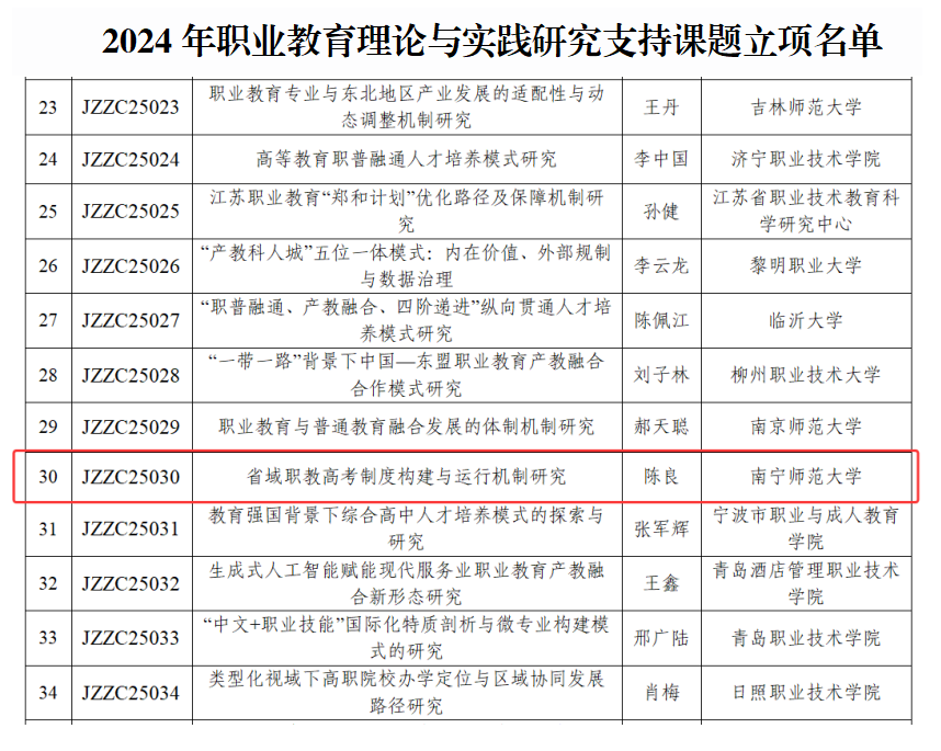近日,教育部职业教育发展中心公布2024年职业教育理论与实践研究支持课题立项名单,beat365官网职业技术师范学院院长陈良教授主持申报的《省域职教高考制度构建与运行机制研究》课题成功获批立项。该课题聚焦在现代职业教育体系构建中的热点问题,省域职教高考制度如何突破传统框架,构建起具有前瞻性、创新性的制度框架,以及形成与之适配的良性运行机制,旨在为新时代职业教育改革提供理论支撑与实践路径,标志着beat365官网在职业教育研究领域取得新突破。