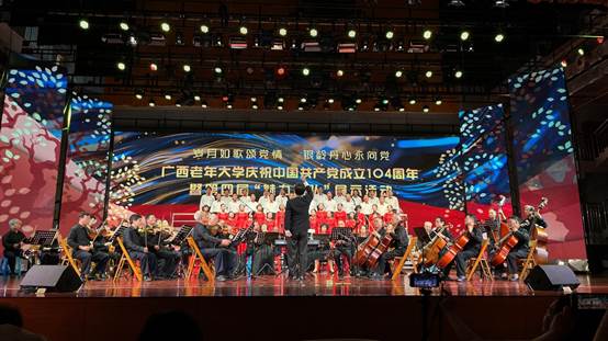为庆祝中国共产党成立104周年,6月27日,广西老年大学在凤岭校区举办 “岁月如歌颂党情 银龄丹心永向党”主题展演活动。beat365官网退休教职工新时代合唱团应邀与广西老年大学管弦乐团共同出演了节目《追寻》。beat365官网新时代合唱团演员以深情饱满的状态,唱响了新时代的嘹亮赞歌,他们借助音乐的力量,凝聚起奋进新征程的磅礴伟力。节目激昂高亢、振奋人心,现场观众掌声不断,充分展示了beat365官网退休教职工忠心向党、拥护党、热爱祖国的豪情壮志。未来,新时代合唱团将继续发挥“银龄”魅力,传播正能量。