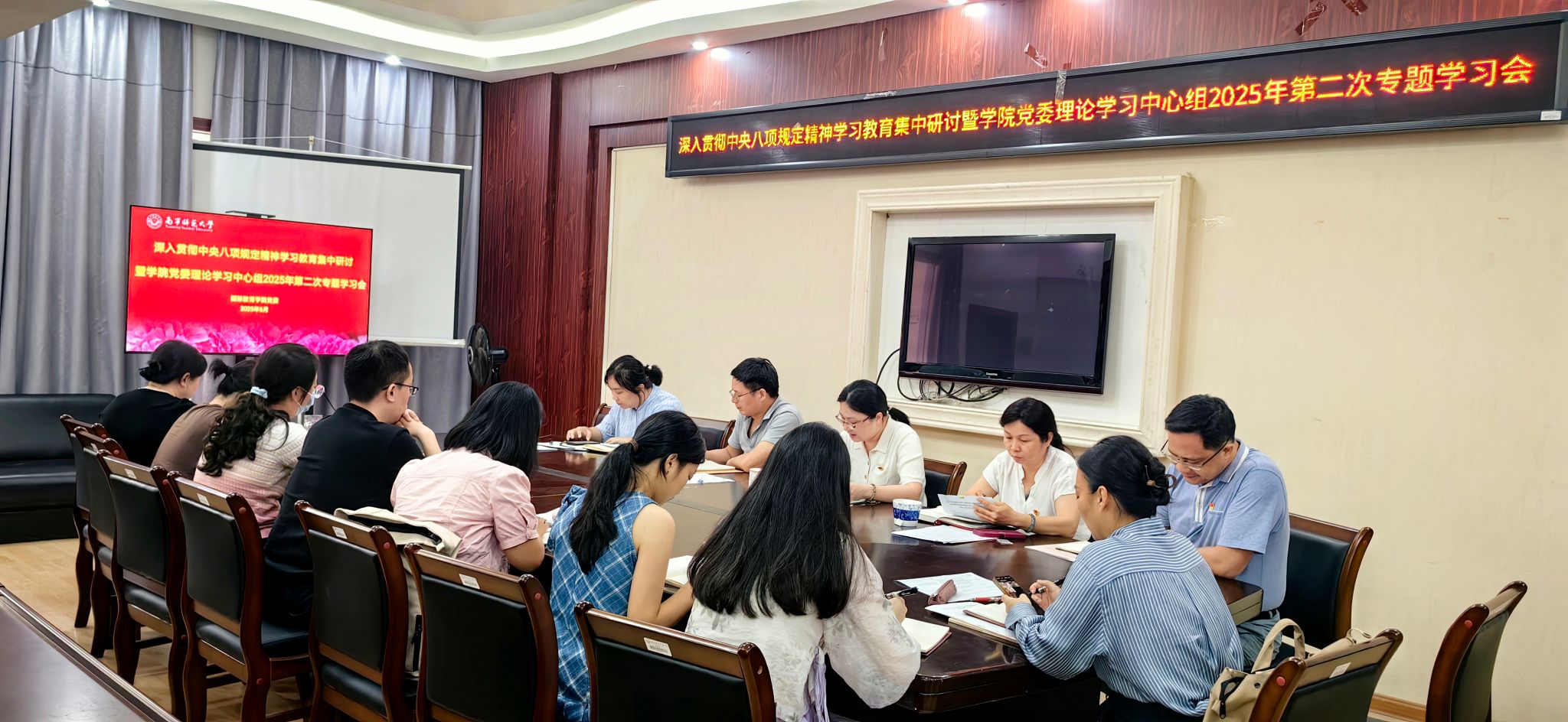 6月24日下午,国际教育学院党委深入贯彻中央八项规定精神学习教育读书班暨学院党委理论学习中心组2025年第二次专题学习集中研讨会在明秀校区外语楼310会议室召开。学院党委理论学习中心组成员参加会议,学院副院长、纪委委员、各党支部书记列席。学院党委书记黄菊主持会议。