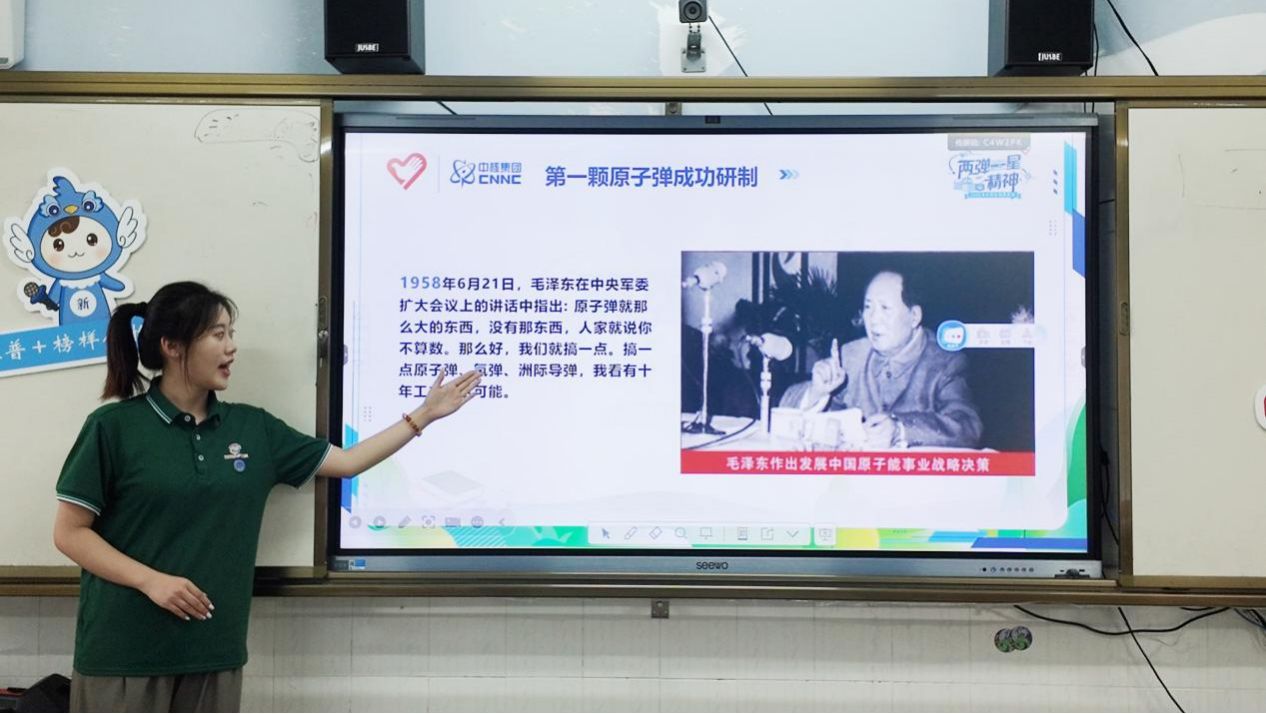 后勤组成员张子怡以“图文 + 现场讲解”的形式,将铀矿石从广西深山被发现、到经提纯转化为核燃料、最终助力第一颗原子弹升空的“三生三世”缓缓道来。讲解中,她为同学们播放了1964年10月16日罗布泊核爆试验的影像 ——当蘑菇云在戈壁滩上骤然升腾,镜头里科研人员欢呼拥抱的身影与屏幕外孩子们的屏息形成奇妙共振。那些带着颗粒感的黑白画面里,既有“开业之石”铀矿石的质朴光泽,也有“干惊天动地事”的元勋们在帐篷里演算的灯光,孩子们透亮的眼睛里,先映出蘑菇云的壮阔,又慢慢漾起对“隐姓埋名人”的崇敬。