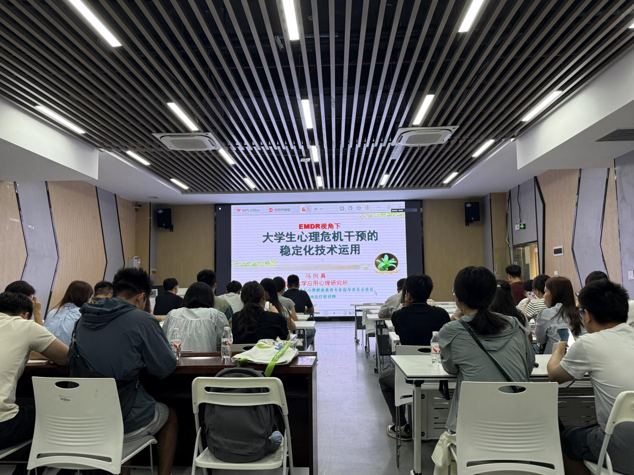 培训特邀东南大学应用心理研究所所长马向真教授担任主讲。马教授以“EMDR视角下大学生心理危机干预的稳定化技术运用”为主题,从理论框架、操作流程、实用技术及典型案例四个维度进行了系统阐述。她结合丰富的临床实践与研究成果,深入浅出地介绍了眼动脱敏与再加工(EMDR)技术在心理危机干预中的应用价值,重点解析了稳定化技术的核心原理与操作要点,并通过生动的案例演示,具体指导如何在实际工作中有效运用这些技术,从而提升干预的及时性与有效性。