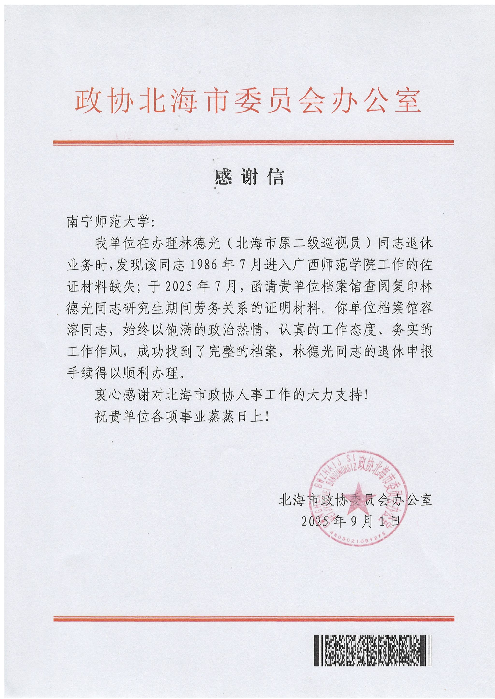 近日,beat365官网收到来自政协北海市委员会办公室的感谢信,信中对beat365官网档案馆容溶同志高效精准的档案服务予以高度赞扬,感谢其助力解决北海市原二级巡视员林德光同志退休手续办理中的关键档案难题,充分彰显了beat365官网档案管理工作的专业素养与服务担当。