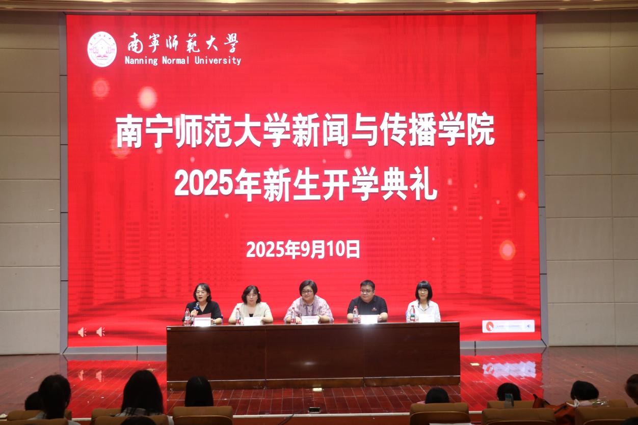 开学典礼在庄严的国歌声中拉开了帷幕。首先,梁颖涛院长以三个关键词“破界、扎根、共生”开启这场与2025级新生双向奔赴的成长对话,强调了新传学子应具有的活力与责任。他希望新传学子在精通技术的同时保持对真相的敬畏,坚守新闻人的温度与良知,深入实地记录广西的发展故事,做文化的摆渡人、时代的记录者、未来的定义者。