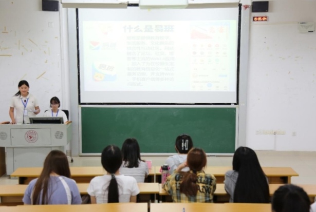 主持人阳佳慧对易班工作站的相关内容进行系统介绍,包括易班 app 的各项功能介绍,易班负责人的推选,文学院易班工作站组织架构、日常运作、主要职能、线上线下工作开展情况、“易班先进班级”和“易班之星”的评选。