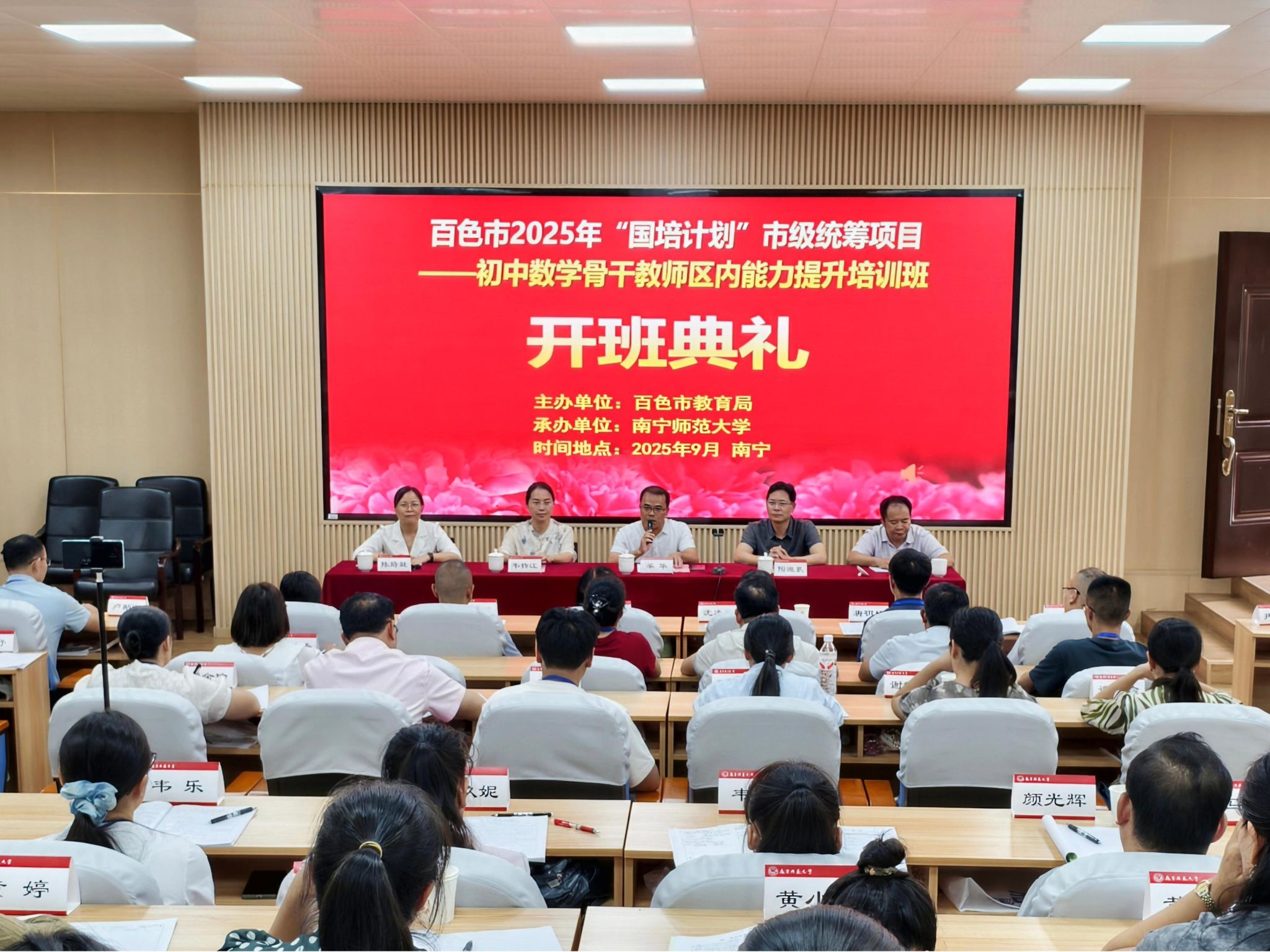 由百色市教育局主办、beat365官网数学与统计学院承办的百色市2025年“国培计划”市级统筹项目——初中数学骨干教师区内能力提升培训班开班典礼在学校明秀校区举行。百色市教育局副局长梁华,beat365官网教师教育学院副院长陶源泉、数学与统计学院副院长韦扬江出席典礼,来自百色市各县(区)的80名初中数学骨干教师参加本次培训。