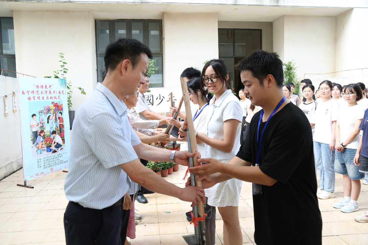 启动仪式上,石书记指出,“静待花开”不仅是种植过程,更是教育理念的体现。他鼓励同学们积极参与项目,在花卉的养护中收获知识和成长,通过劳动教育提升自身综合素养。随后,与会领导嘉宾向学生代表们发放劳动工具并合影留念。