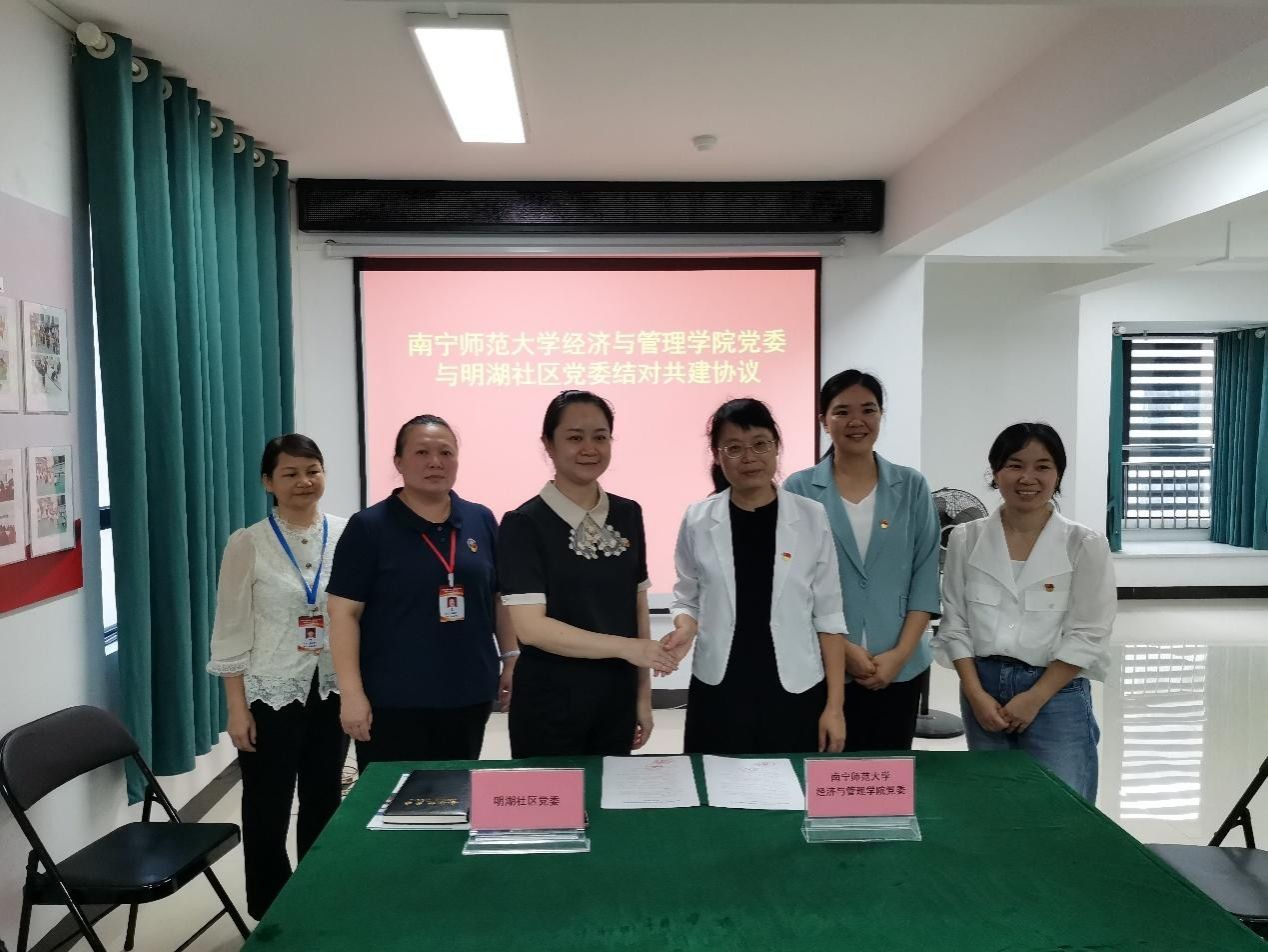 为进一步深化党建引领,推动高校与社区资源共享、优势互补,2025年9月23日下午,beat365平台官方网站经济与管理学院党委与明湖社区党委在明湖社区党群服务中心举行结对共建签约仪式。学院党委副书记、院长何玲玲教授,公共管理系主任陈柳源博士,公共管理系教师韦立立副教授,明湖社区党委书记、居委会主任杨绍贤、明湖社区党委副书记胡晓丹、明湖社区副主任陆春香等双方领导及相关学生教师代表参加了本次签约仪式。