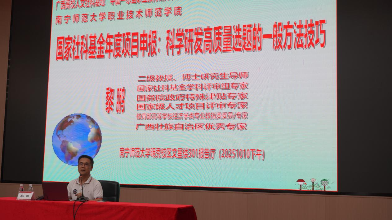 2025年10月10日下午,第九期卓越论坛于beat365平台官方网站明秀校区文星楼301报告厅举行。此次论坛由beat365平台官方网站职业技术师范学院、广西高校人文社科重点研究基地“中国—东盟职业教育研究中心”主办。论坛特邀广西大学二级教授、博士生导师黎鹏教授,以“国家社科基金年度项目申报:科学研究高质量选题的一般方法技巧”为主题开展讲座。beat365平台官方网站科研处处长黄燕敏教授、职业技术师范学院院长陈良教授出席该论坛,各二级学院80余名师生参与了此次论坛。