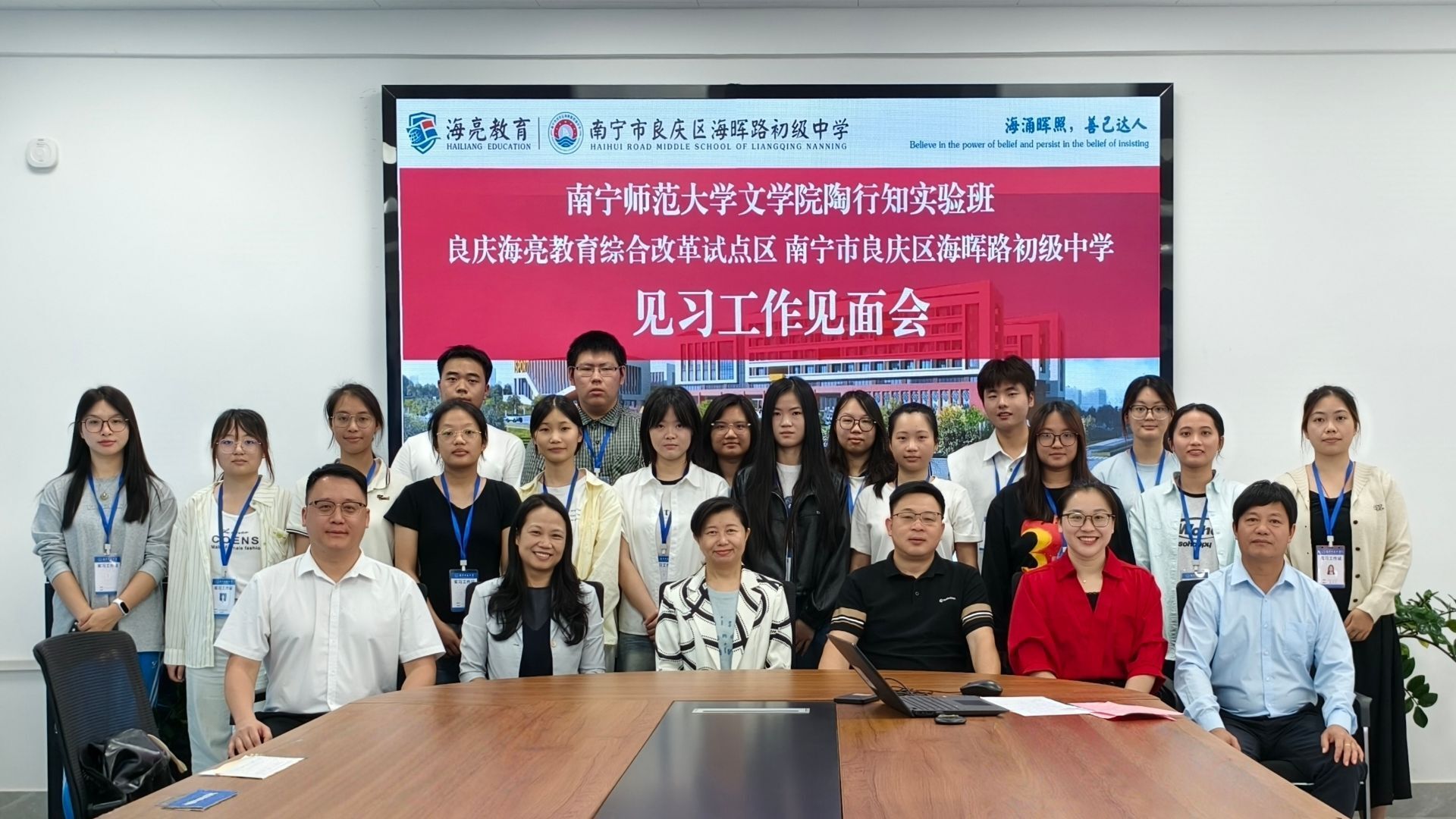 2025年10月20日,文学院2023级陶行知实验班与南宁市良庆区海晖路初级中学在晖照楼三楼会议室举行见习合作见面会。双方领导、指导教师及18名陶班见习生参会。