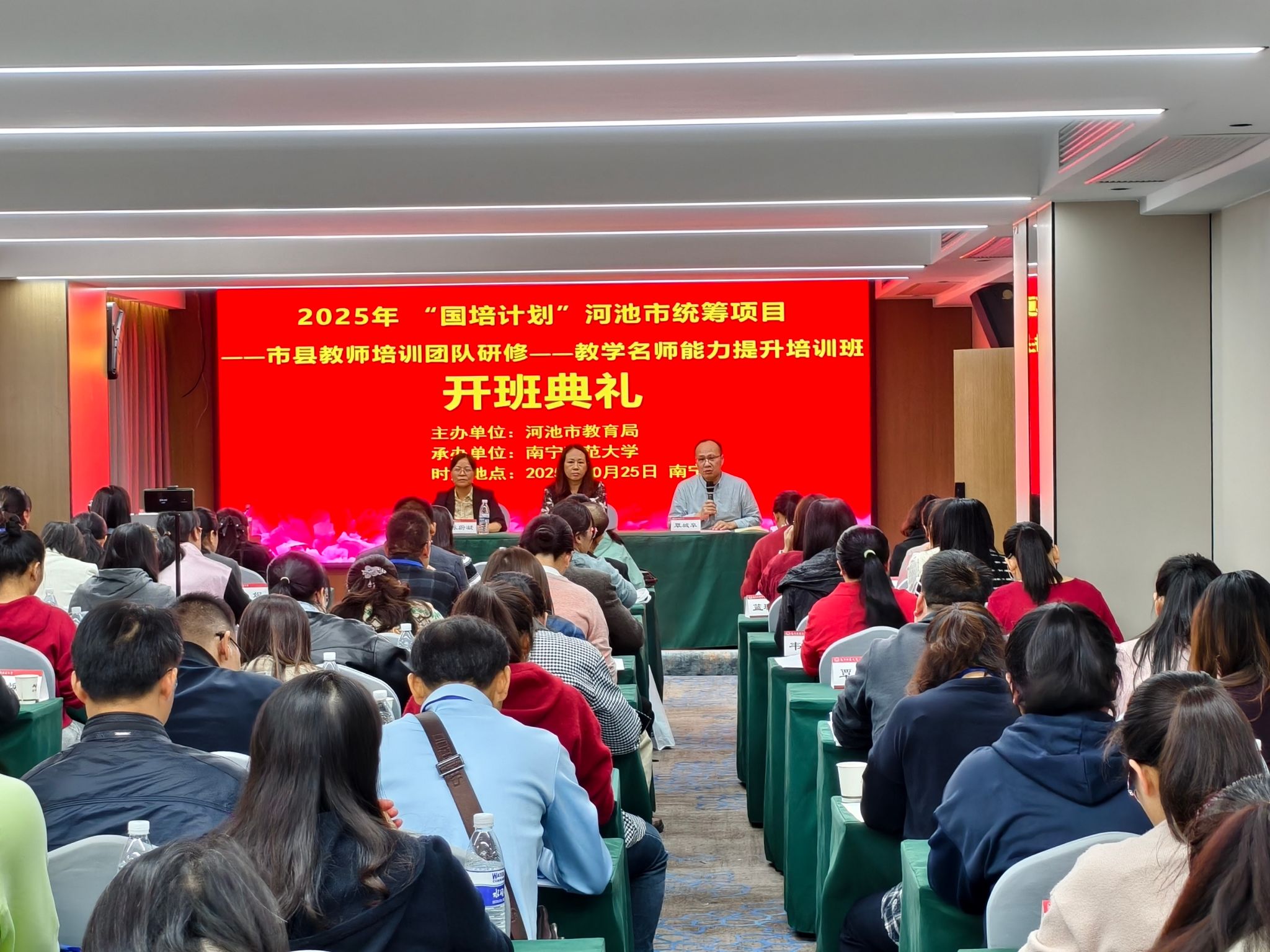 2025年10月25日,2025年“国培计划”河池市统筹项目——教学名师能力提升培训班在beat365平台官方网站正式开班。本次培训为期8天,将持续至11月1日,旨在进一步提升河池市中小学教学名师的专业素养与教学能力,来自河池市各县区的近百名中小学教学名师共同参与此次培训。