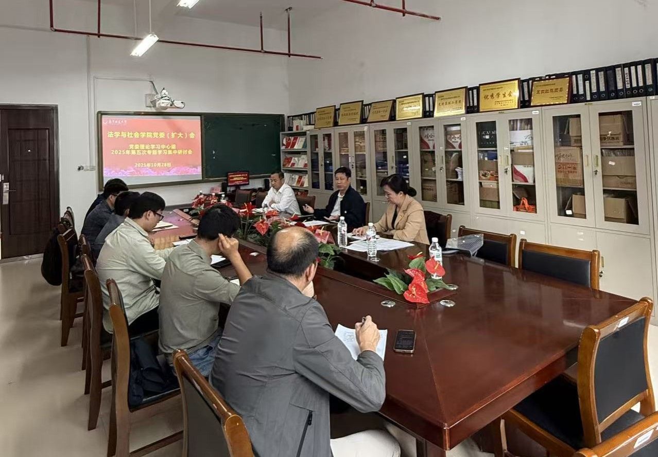 10月28日下午,法学与社会学院党委理论学习中心组2025年第五次专题学习集中研讨会在五合校区理综楼604-2会议室举行。学校领导张松涛副校长到会巡听旁听并指导,学院党委理论学习中心组成员参加会议,副院长(主持院长工作)吴少进列席会议。会议由学院党委书记许建主持。