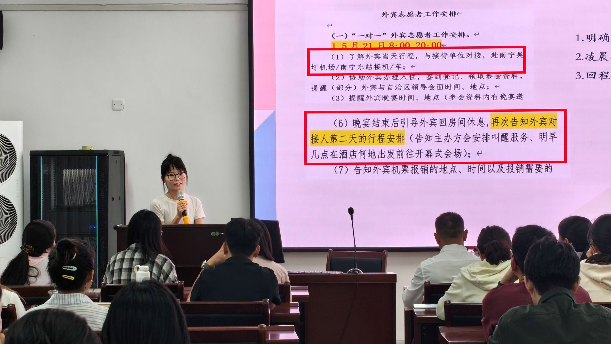 首先,2024级学术班许茵茵同学分享了她在东盟矿业合作大会担任志愿者的经历。她指出,工作中要具备前瞻意识,特别强调细节把控、应急处理与跨文化交际能力的重要性。随后,2024级学术班赵诗静同学以2025年中国—东盟博览会斯里兰卡展位陪同翻译的实践为例,从具体案例和个人体会两方面展开,进一步印证了灵活应对能力在实际工作中的关键作用。