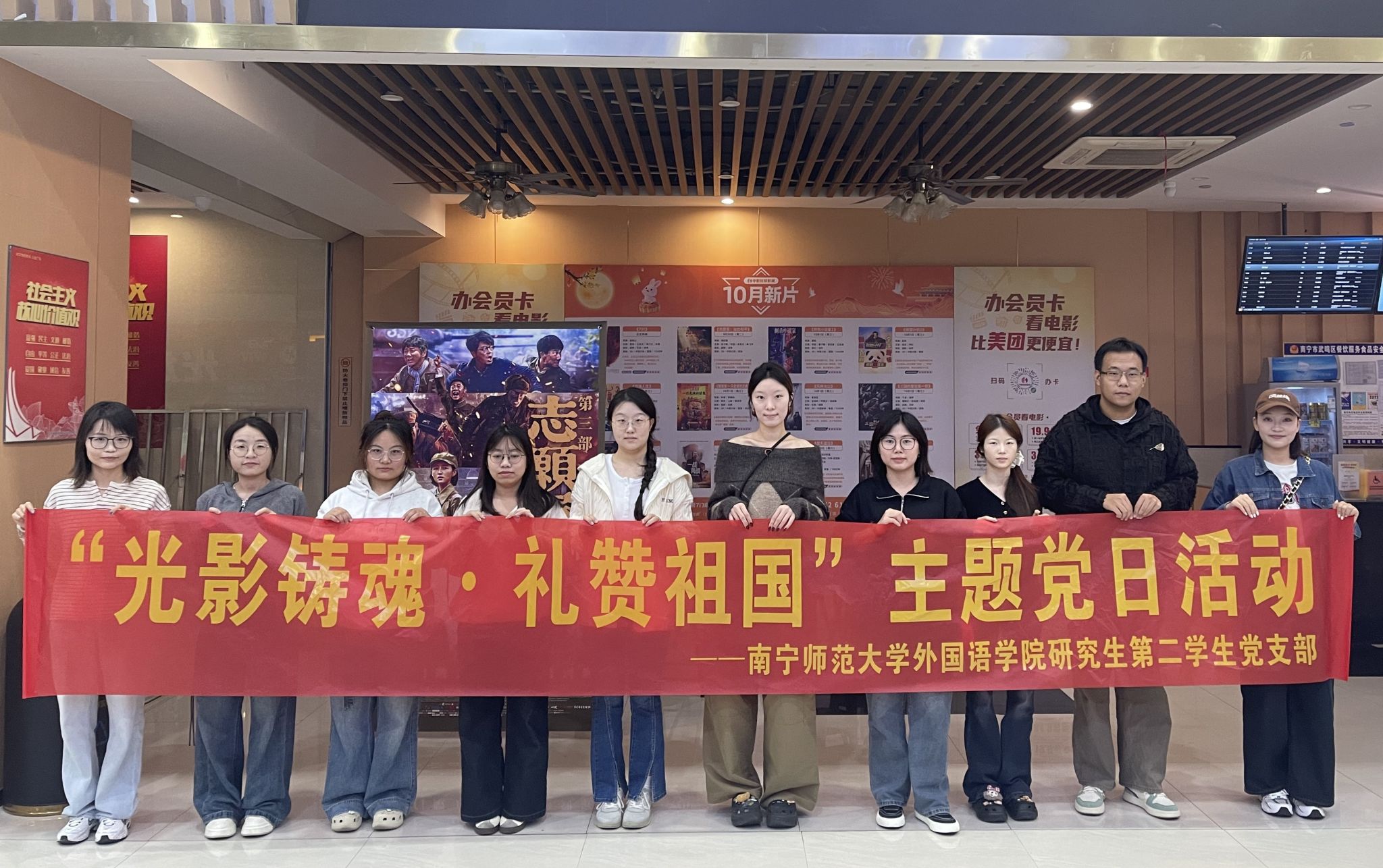 为深入推进爱国主义教育,传承红色基因,激励广大青年党员铭记历史、砥砺前行,10月24日下午,外国语学院研究生第二学生党支部组织部分学生党员开展了“光影铸魂·礼赞祖国”主题党日活动,集体观看了展现抗美援朝伟大精神的影片《志愿军:浴血和平》。