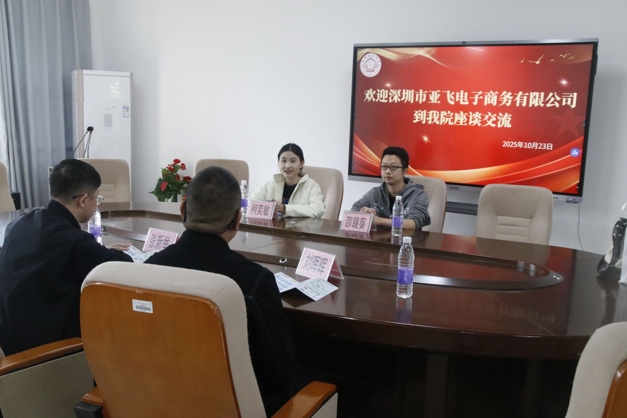 交流中,公司代表柯奕敏首先向学院两位老师简要介绍了公司基本情况与业务成就,以及计划在广西设立子公司、校招生培养等相关发展规划。随后,刘晖晖副书记结合亚飞电子商务公司业务范围与发展需求,介绍学院的学科专业及毕业生情况,同步推动学生与企业进一步对接;他还分享了此前亲自前往深圳龙岗区调研考察的经历,肯定了亚飞电商扎实的发展基础与突出的发展成果。