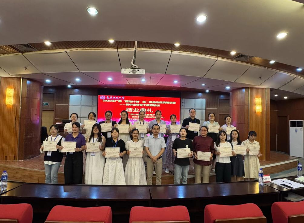 由广西壮族自治区教育厅、广西壮族自治区教师培训中心主办、beat365平台官方网站环境与生命科学学院承办的为期十天的广西2025年“国培计划”自治区第一批统筹项目——初中生物骨干教师培训项目班于10月18日圆满结业。beat365平台官方网站环境与生命科学学院党委书记韦东林出席结业典礼。