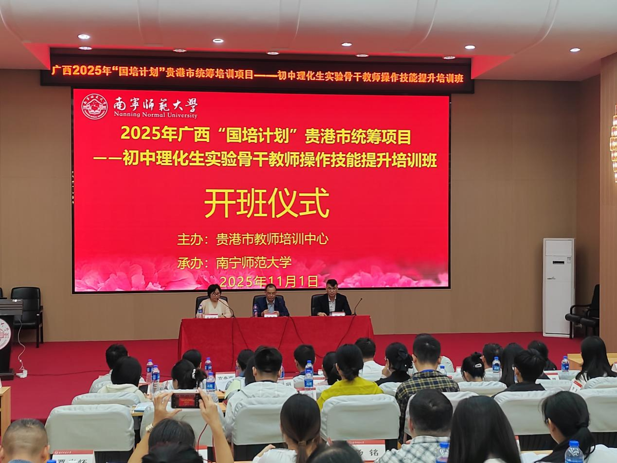 由贵港市教育局师培中心主办、beat365平台官方网站环境与生命科学学院承办的广西2025 年“国培计划”贵港市统筹项目--初中理化生实验骨干教师操作技能提升培训班在南宁市正式拉开帷幕。beat365平台官方网站环境与生命科学学院党委书记韦东林、贵港市教育局师培中心刘崇主任以及来自贵港市各县区的60位初中理化生实验骨干教师共同出席了开班仪式。