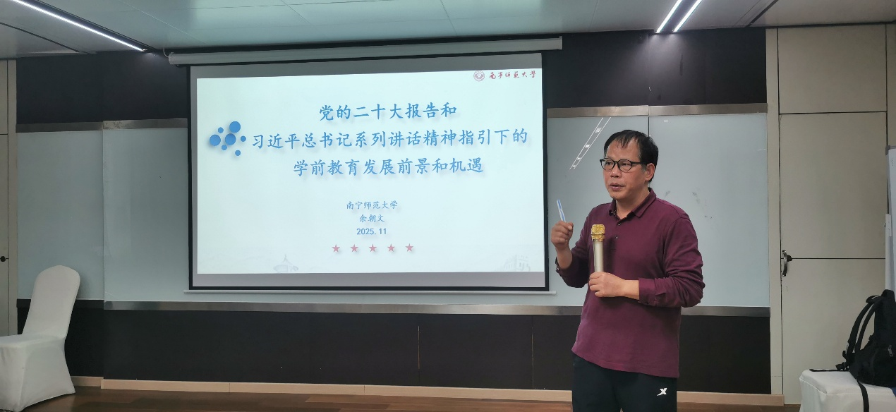开班典礼结束后,余朝文书记作了《党的二十大报告和习近平总书记系列重要讲话精神指引下的学前教育发展前景和机遇》的专题报告,从党的二十大报告及二中、三中、四中全会精神和习近平总书记系列重要讲话精神、国家到地方的支持政策、AI时代发展等方面深入解读带给学前教育事业发展的前景、机遇和挑战。