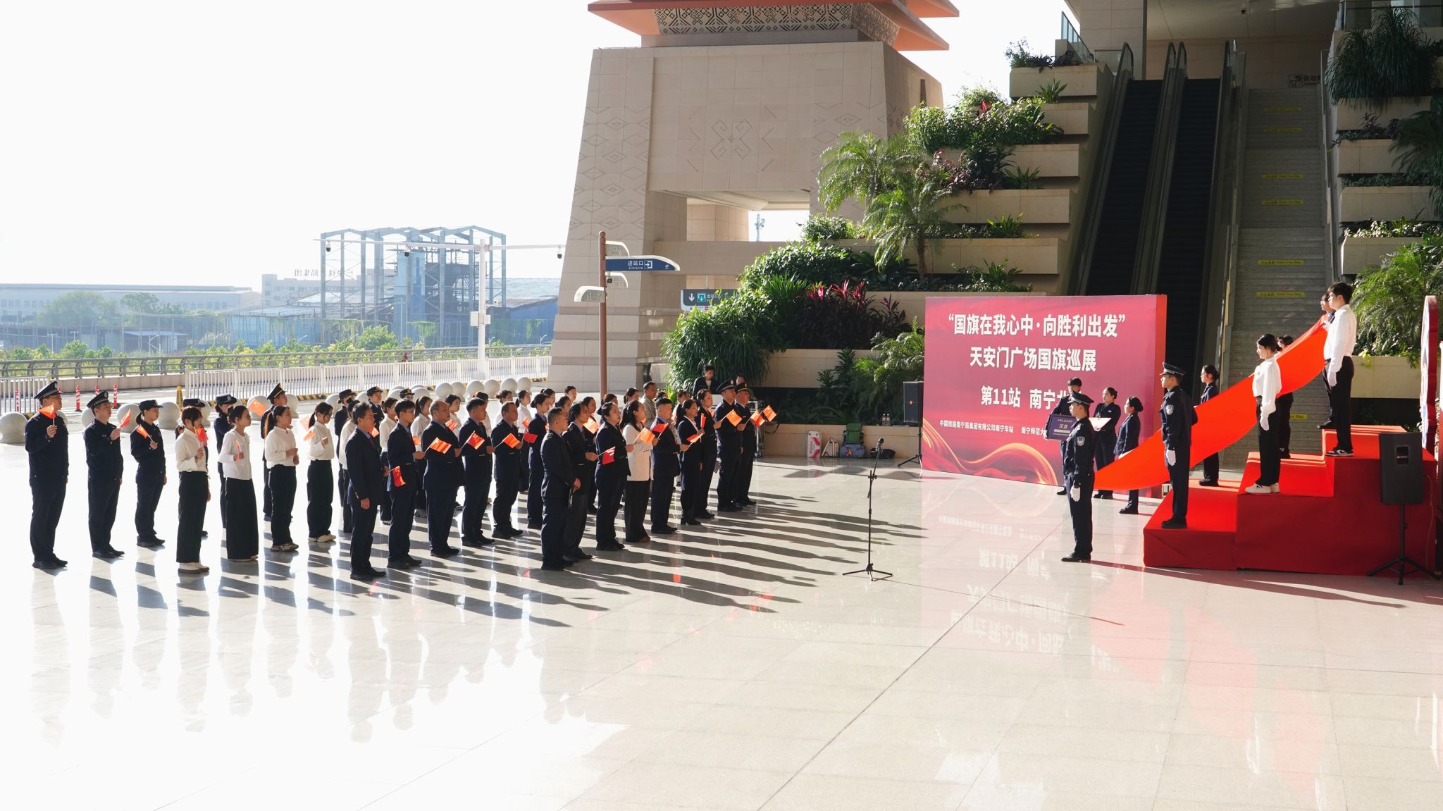 为深入学习贯彻党的二十届四中全会精神,厚植研究生党员爱国主义情怀,强化党建联盟单位协同育人实效,11月14日上午,旅游与文化学院党委副书记黄珍、研究生党支部书记陈春容带领支部成员,赴南宁北站落客平台,与南宁车站、南宁北站派出所等党建联盟单位共同参与“国旗在我心中——向胜利出发”天安门广场国旗巡展第11站(南宁北站)爱国主义教育活动,在庄重仪式与深度互动中传承红色基因,凝聚旅文学子奋进力量。