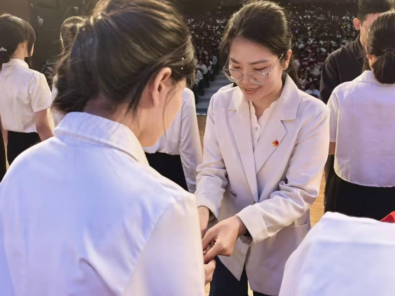 仪式在激昂的《义勇军进行曲》中正式拉开序幕。在“宣布新团员名单”环节后,辅导员老师们为新团员佩戴团徽。闪亮的团徽不仅是一份荣誉的象征,更是一份承载着组织信任与时代嘱托的责任。在辅导员张硕老师的带领下,新团员们进行庄严的宣誓礼。字字铿锵,句句千钧,展现了新一代青年为共产主义事业奋斗的坚定信念与责任担当。