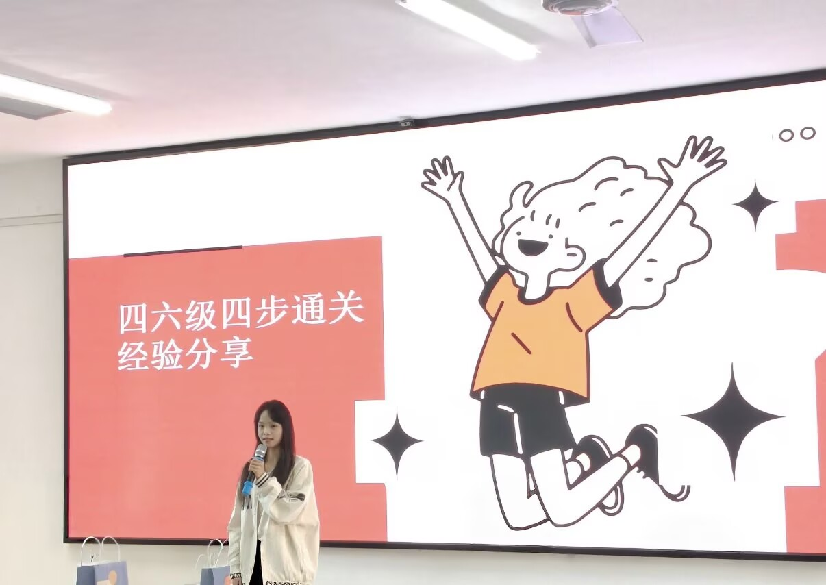 随后在报告厅举行的英语学习座谈会将活动推向高潮。22级行知班吴浩宇以“泡菜哲学”生动比喻英语学习,强调在兴趣引导下实现高质量输入,通过跟读、模拟对话和写作记录等方式完成有效输出,并指出英语不仅是一套规则与技能,更是一个真实世界、一扇新视野大门和一座人际桥梁;23级英语3班张喜祥就四六级的备考做了“四步通关”经验介绍,即树立自信、掌握方法、落实计划与总结复盘;25级学科英语班莫广莲则针对考研英语作了详尽分享,系统梳理备考重点与策略,为同学们明晰了今后的备考方向。最后的趣味语言互动游戏环节,如“单词接龙”“句子速拼大挑战”等,充分调动了同学们的参与热情,大家在轻松愉快的氛围中进一步增强了对语言学习的兴趣。