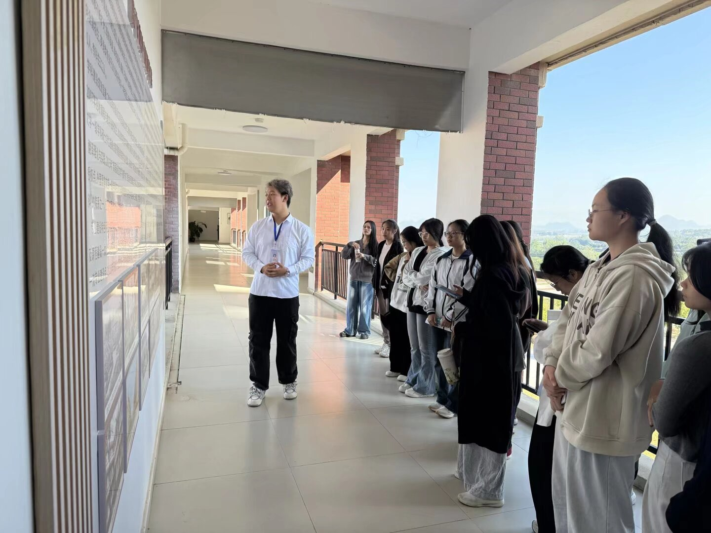 活动伊始,在讲解员的引导下,同学们依次参观了外国语学院的文化长廊与语言实验室。文化长廊生动展现了学院的发展历程、党建引领成果、人才培养、师资力量及优秀校友风采等;而语言实验室的开放则让同学们近距离体验了同声传译、日语文化、虚拟仿真等现代化教学设施,现场气氛活跃,交流互动热烈。