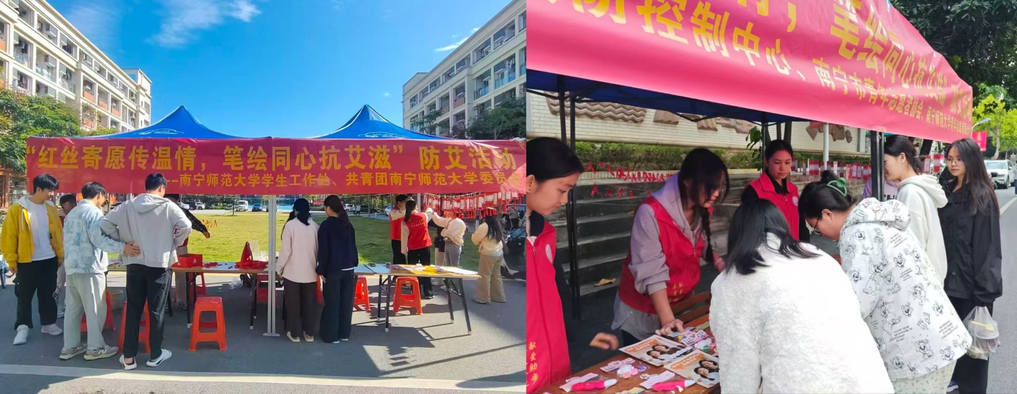 为进一步普及防艾知识,提升学生科学防护意识,筑牢健康校园防线,11月20日至23日,beat365官网分别在明秀、五合、武鸣校区开展“红丝寄愿传温情,笔绘同心抗艾滋”主题活动。本次活动由南宁疾控中心、南宁青协、校学生工作处、校团委联合主办,校青年志愿者联合会承办,累计吸引3000余名学子参与,现场互动氛围浓厚。