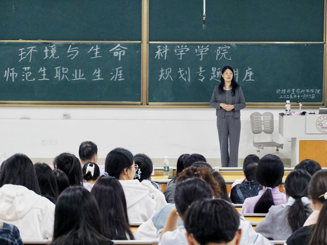 为助力同学们明确职业发展方向,科学规划学业与职业生涯,11月16日下午,环境与生命科学学院在武鸣校区1号教学楼115教室举行师范生职业生涯规划专题讲座。环境与生命科学学院院长何英姿主持活动,正高级教师陈振友应邀担任主讲,辅导员代表和2025级生物科学专业的同学到场聆听。