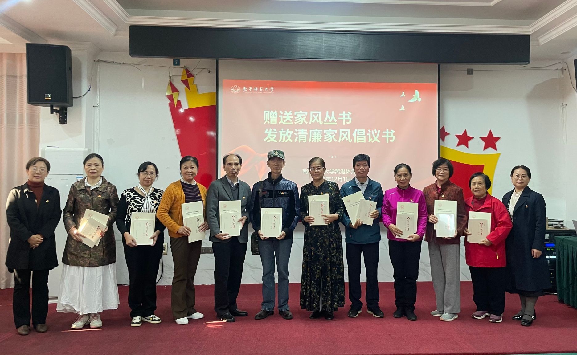 活动中,全体党员集中聆听广西区直机关工委党校教授所作的《深入学习贯彻党的二十届四中全会精神》专题报告,报告系统阐释了全会的核心要义与实践要求,帮助老党员们深刻领会党中央决策部署,进一步凝聚思想共识。离退休党委通报了2025年度工作完成情况与下一步工作计划,并向各党支部发放《永葆廉洁本色 传承清廉家风——致全体离退休干部党员的倡议书》,赠送《习近平关于注重家庭家教家风建设论述摘编》《百年红色家书品读》等家风建设丛书,号召老同志们坚守“离岗不离党”初心,以言传身教涵养清廉家风,用实际行动助力社会清风正气建设。