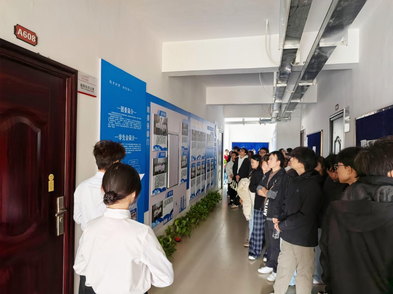 数统学院系统化、功能化的楼层空间全面展示了学院深厚的育人底蕴与卓越成果,获得了参观学生的高度评价。一楼大厅的学子风采与实习实践成果的展板是学院形象的展示窗口,更通过“深造学生风采展”、“陶行知班实习印记”以及“数润边疆”暑期社会实践成果等板块,生动记录了学子们从课堂学习到教学实践、从学科竞赛到服务社会的成长轨迹。到二、三楼配备先进设备的金融统计建模、数据科学等专业实验室,以及校企共建联合实验室,为学生提供了将理论转化为解决实际问题能力的平台。在四楼与五楼的核心科研区,学院强大的科研平台与师资力量成为焦点。在讲解员介绍到广西应用数学中心及各研究方向的前沿进展时,学生们凝神听讲,深刻感受到学院的学术竞争力。六楼的现代化的智慧教室和心理健康工作服务站,共同构建了一个“硬支撑”与“软环境”并重的育人生态。详细的学生工作文化墙和丰富的学生组织展示,全面呈现了学院“以生为本”、助力学生全面成长的全链条育人体系。