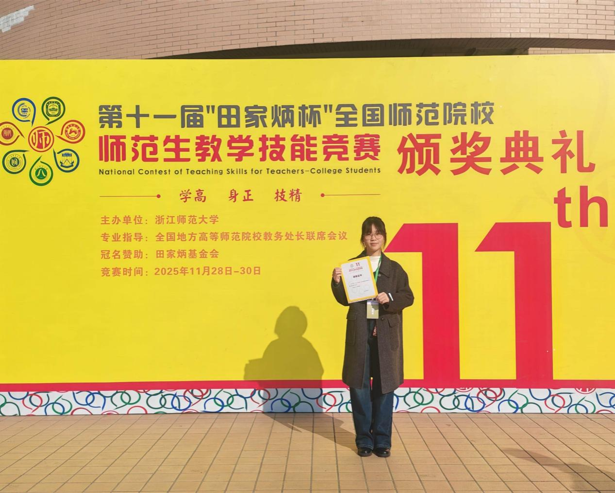 11月29至30日,在浙江师范大学举办的“田家炳杯”第十一届全国师范院校师范生教学技能竞赛决赛中,人工智能学院2022级教育技术学专业学生刘秋娟表现出色,荣获信息技术组全国一等奖。这是学院在该项国家级赛事中取得的重要突破。