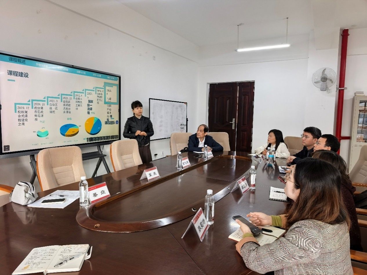 随后,双方围绕一流课程建设进一步聚焦如何应对当前大学英语教学所面临的挑战。我院国家级一流本科课程《大学英语A1》负责人蔡焱老师从课程发展历程、教学改革创新与团队建设,到后续“人工智能+课程”建设等方面,作了详细阐述与分享。来访团队对课程建设的创新成果及其显著的示范引领作用,给予了高度评价。