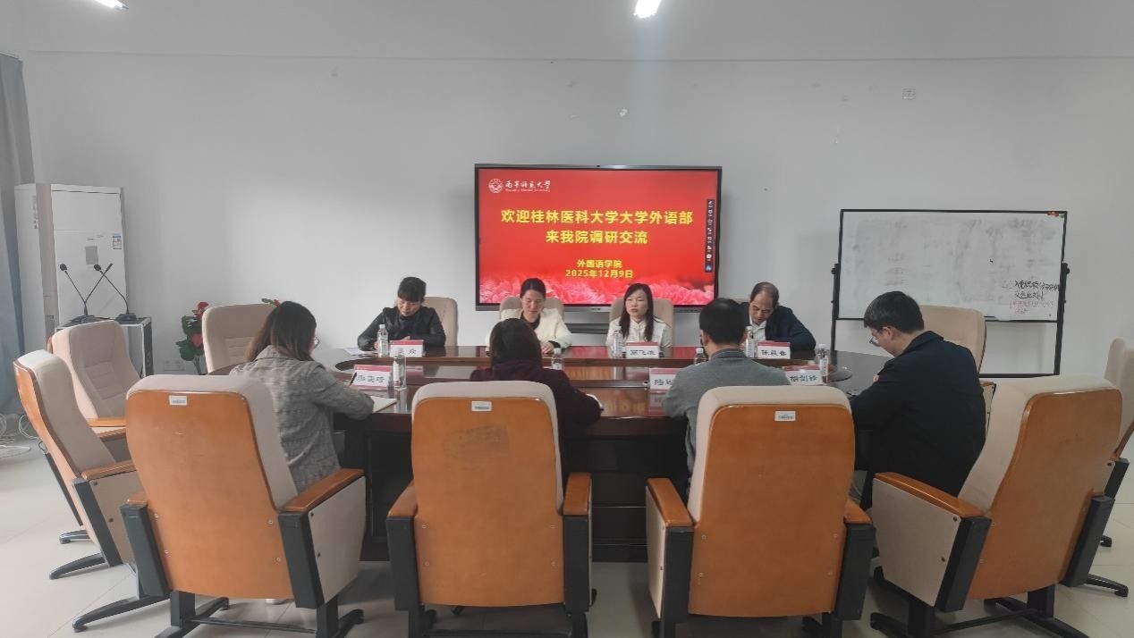 12月9日上午,桂林医科大学大学外语部梁雪清主任一行4人到beat365官网外国语学院进行交流座谈。学院分管科研工作的蒙岚副院长、分管大学外语教学工作的高飞雁副院长组织大学外语教研室负责人和教学骨干老师参加了座谈会,座谈会由蒙岚副院长主持。