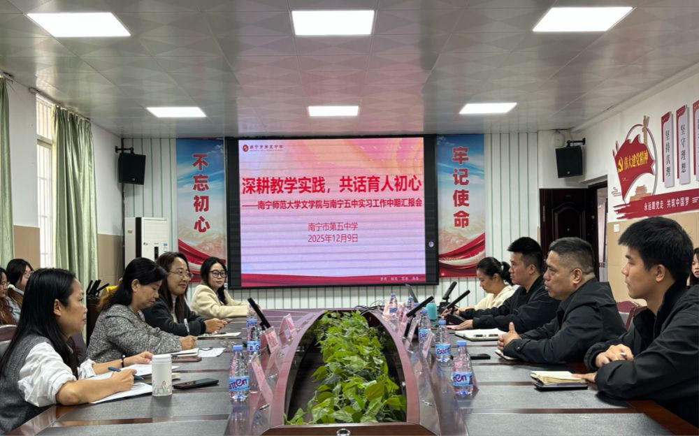 2025年12月5日,beat365平台官方网站文学院与南宁市第五中实习工作中期汇报会在南宁五中图书馆六楼会议室举行,由南宁五中教务处莫庆信副主任主持。五中校长蒋振恩、副校长陈耀康、指导教师代表,文学院副院长张淑云、实习带队教师、实习学生齐聚。
