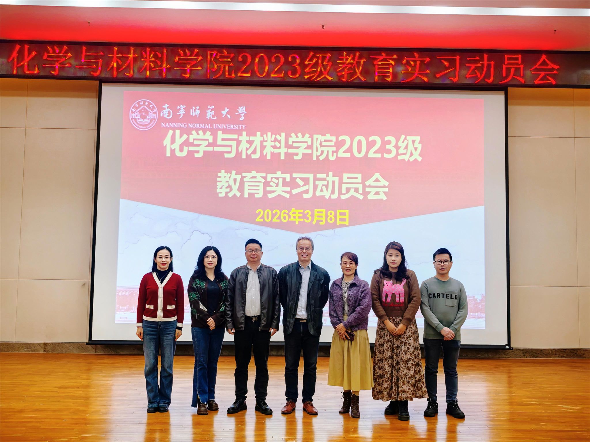 为深入贯彻落实新时代教师队伍建设,扎实推进师范生实践教学,3月8日,化学与材料学院在武鸣校区图书馆报告厅召开2023级化学专业师范生教育实习动员大会。学院党委苏学权副书记(主持党委工作)、党委副书记陈今浩、副院长朱汝葵,现代化学教育技术教研室教师、部分带队实习教师及2023级化学专业全体师范生参加会议。