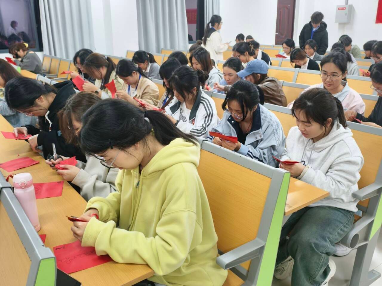 活动伊始,陆林芸同学为大家介绍了剪纸的基本工具与纹样常识,帮助大家梳理了剪纸艺术的历史发展与文化脉络,有效激发了同学们对剪纸的浓厚兴趣和对非遗文化的热爱。随后,她一步步演示了剪纸的完整流程:对折、画线、裁剪。同学们纷纷动手尝试,从简单的四角窗花到复杂的生肖图案,从精致小巧的梅花纹到寓意吉祥的如意纹样,大家耐心创作。现场剪纸声此起彼伏,同学们互相请教、互帮互助,气氛和谐欢快。活动不知不觉进入尾声,一张张普通的红纸在大家的巧手下变成了精美的作品,更有不少同学发挥创意,剪出了别出心裁的个性纹样。