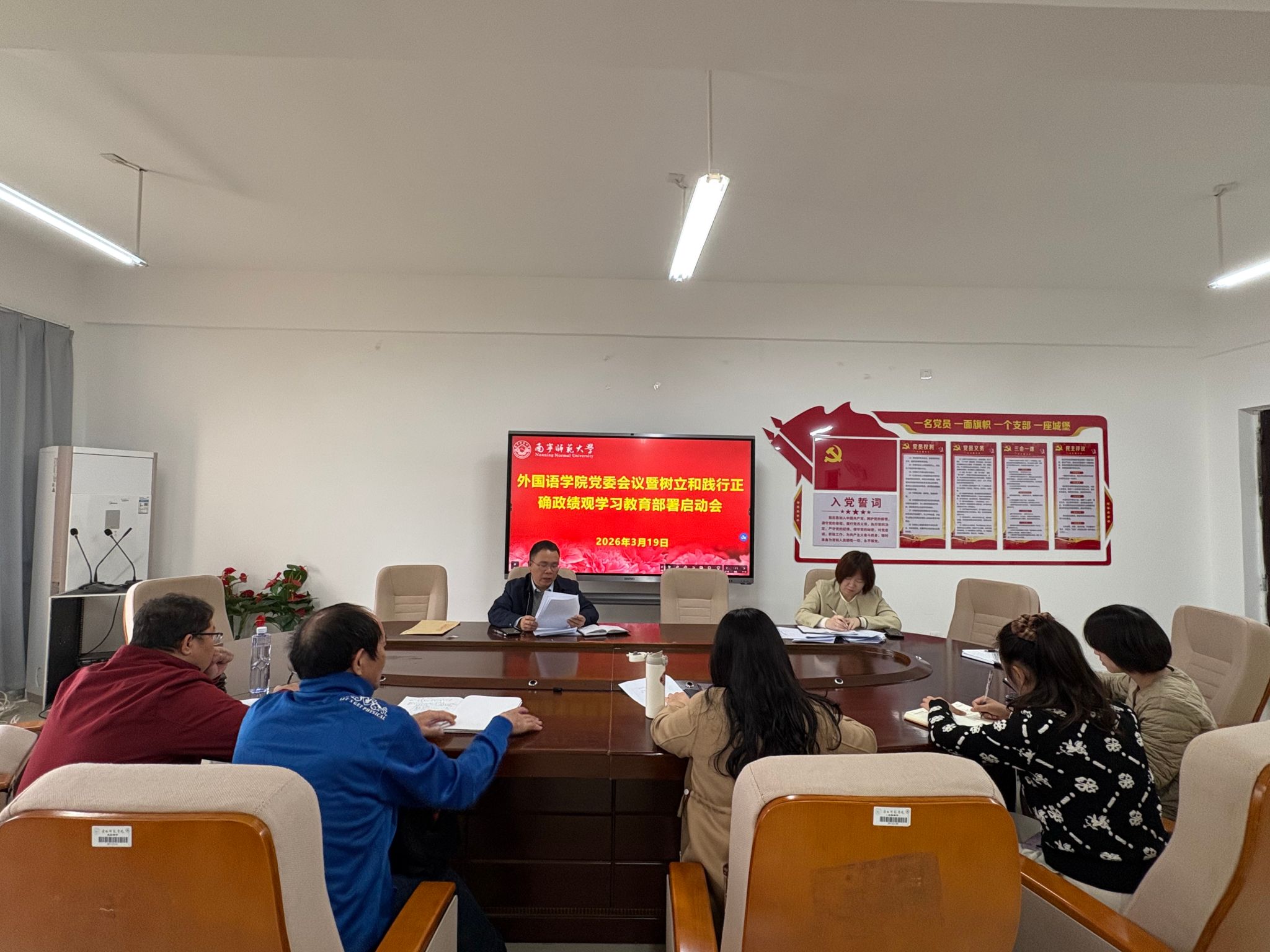 3月19日上午,外国语学院党委在武鸣校区实验教学楼B614召开学院党委党委会议,研究部署启动树立和践行正确政绩观学习教育。学院党委书记苏华主持会议并作学习教育动员部署。学院领导班子成员、党委委员和纪委委员参加会议。