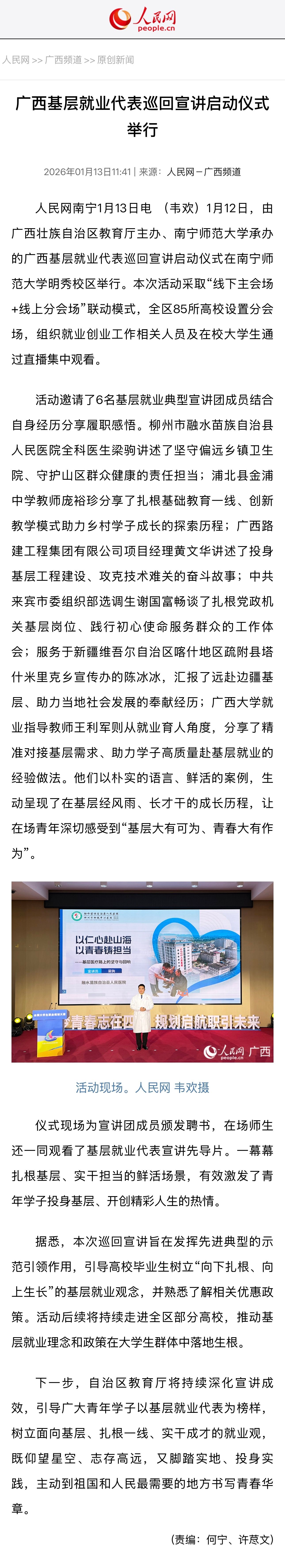 【人民网】广西基层就业代表巡回宣讲启动仪式举行