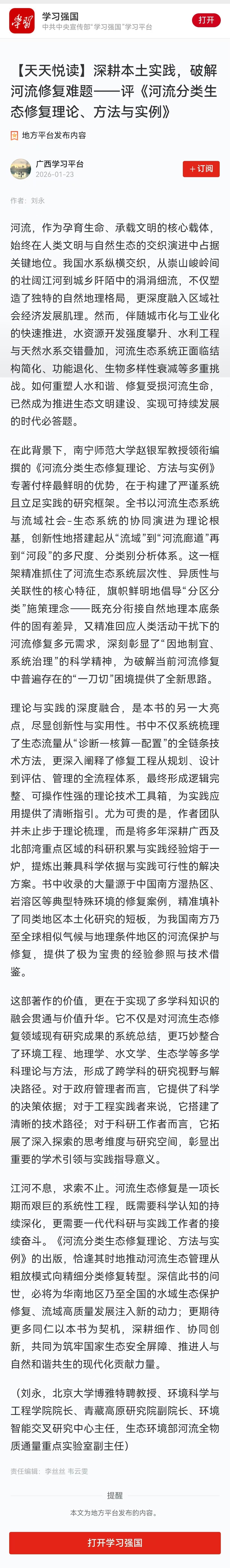 【学习强国】深耕本土实践,破解河流修复难题——评《河流分类生态修复理论、方法与实例》