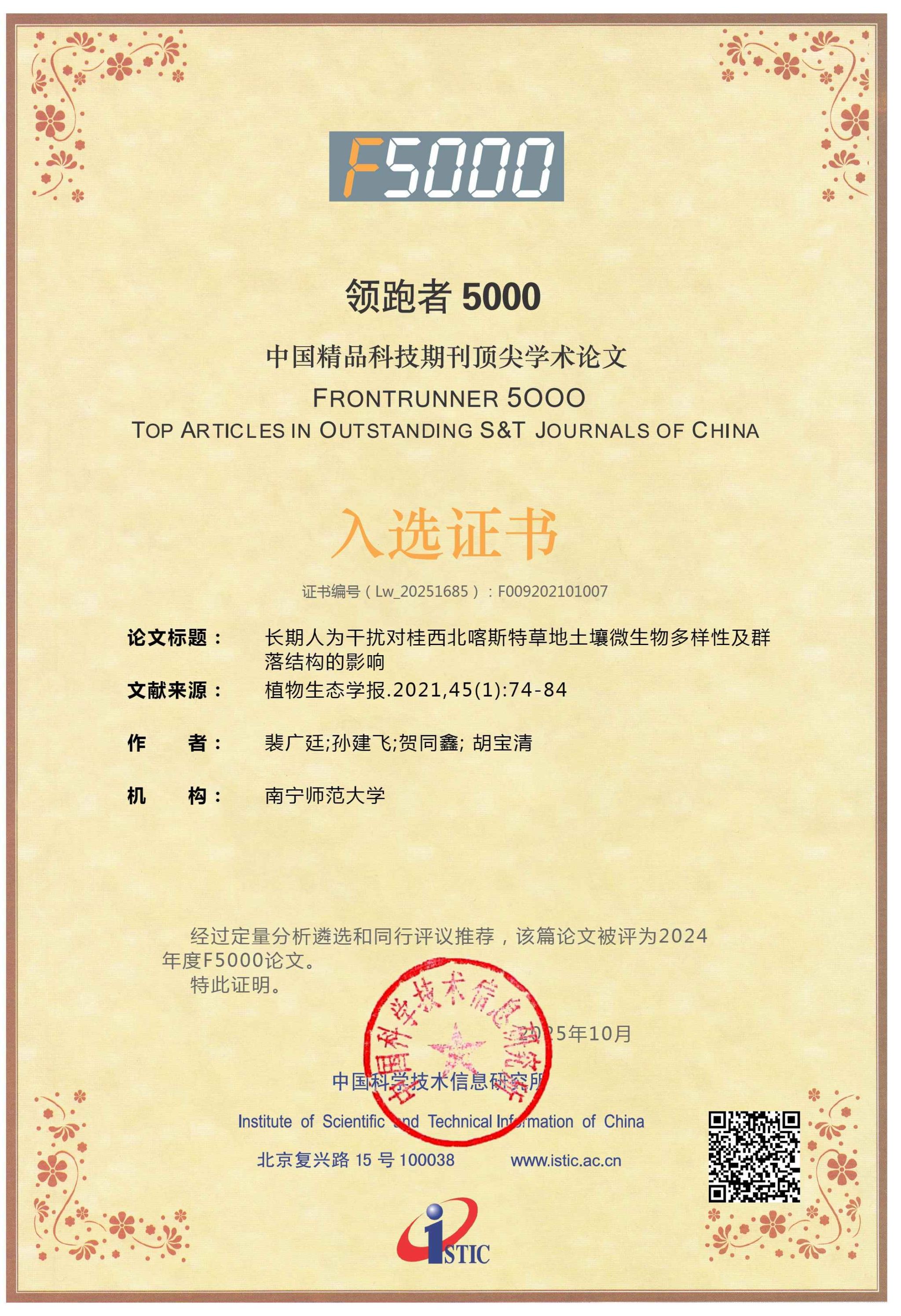近日,国家科学技术部中国科学技术信息研究所正式发布2024年度“领跑者5000——中国精品科技期刊顶尖学术论文”(F5000)入选名单。beat365官网地理与海洋研究院土壤生态过程与石漠化修复团队于2021年发表在《植物生态学报》的论文《长期人为干扰对桂西北喀斯特草地土壤微生物多样性及群落结构的影响》成功入选。该论文同时荣获《植物生态学报》2024年度“优秀论文”,并入选学术精要“高PCSI指数、高被引、高下载”论文榜单,充分彰显了其学术影响力和持续关注度。
