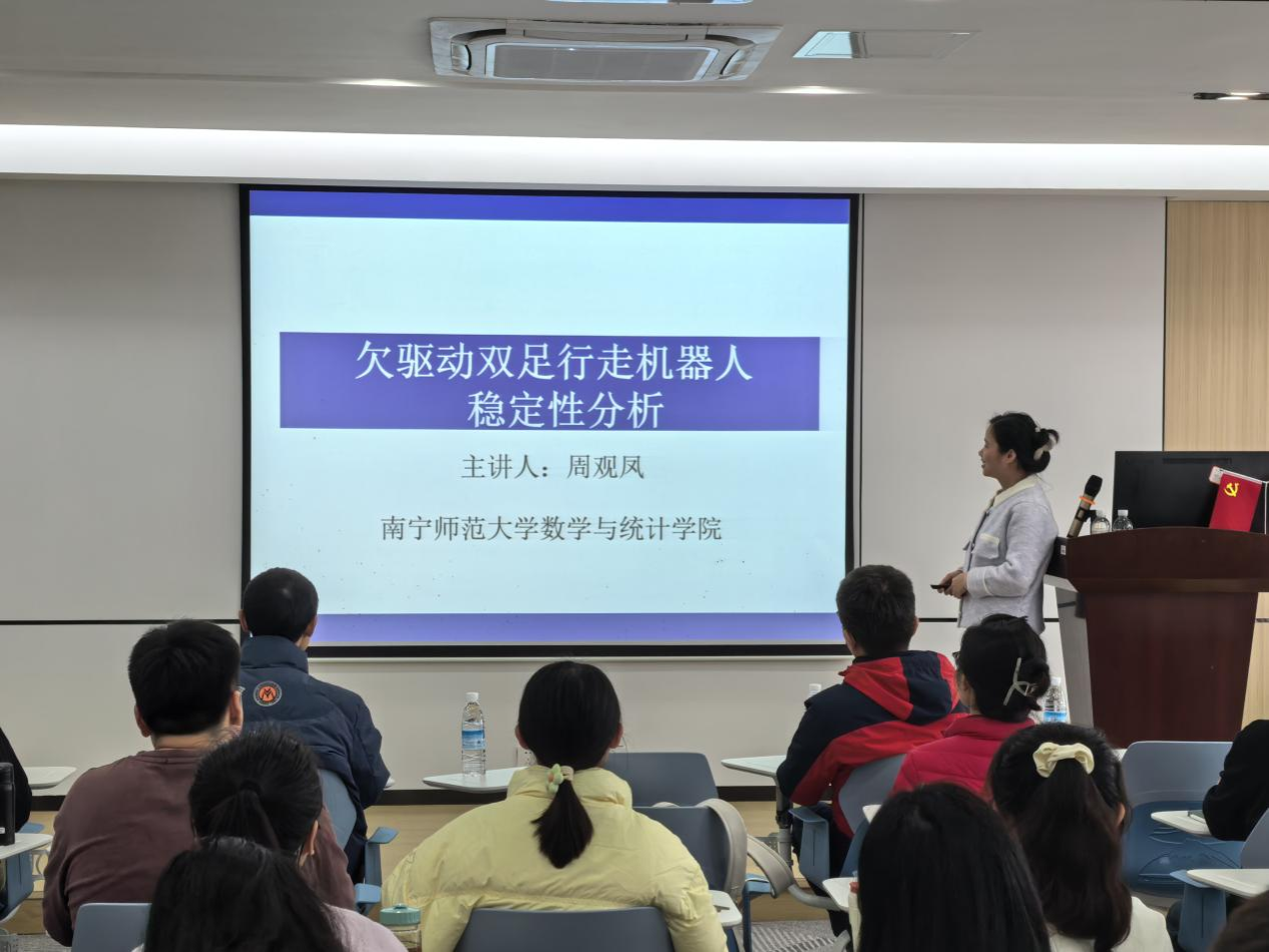 根据学校《关于开展beat365平台官方网站2025年度“青年博士学术报告会”活动的通知》精神,为了进一步浓厚学院学术氛围,激发青年博士的科研创新潜力,促进学院科研工作的高质量发展,数学与统计学院于3月11日成功举办了由周观凤博士主讲的学术报告。周博士以《欠驱动双足行走机器人稳定性分析》为题,向全院教师及研究生分享了她的最新研究成果和见解。此次报告不仅提升了参会者对相关领域前沿技术的认识,也为推动学院学术交流与科研合作注入了新的活力。值得一提的是,周观凤博士的此次报告还标志着数学与统计学院2025年度青年博士学术系列论坛的正式开启,成为该系列论坛中的首场精彩呈现。报告由麦雄发老师主持,学院部分老师、全体学术研究生参加了此次学术活动。