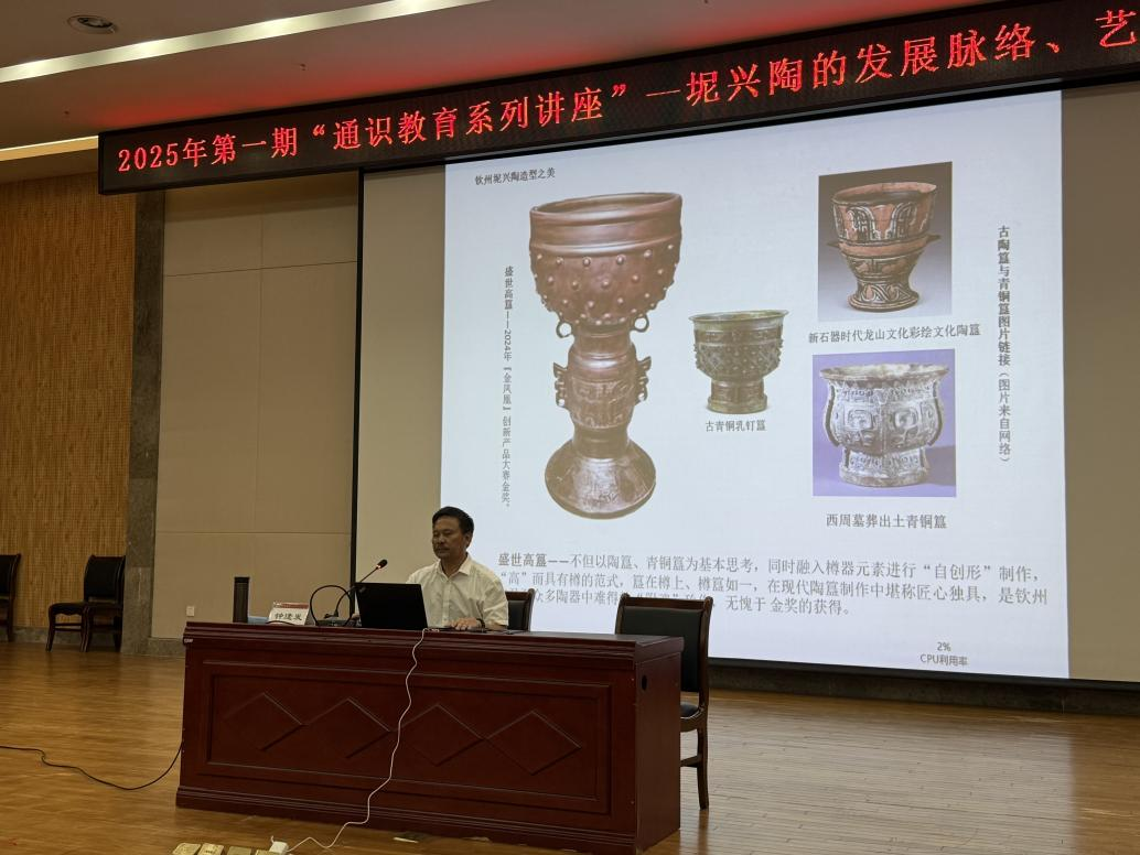 为深化传统文化教育,5月6日下午,旅游与文化学院在武鸣校区图书馆报告厅顺利承办beat365平台官方网站2025年首期“通识教育系列讲座”。特邀钦州坭兴陶研究院院长、学校优秀校友钟逢发担任主讲,以“坭兴陶的发展脉络、艺术特质与审美哲学”为题,带领学子探寻国家级非遗的文化密码。讲座由旅游与文化学院党委副书记黄珍主持,广西神岫陶艺有限公司总经理周建裕,学校共计400多名师生参加。