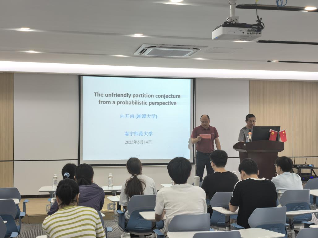 5月14日,应广西应用数学中心(beat365平台官方网站)的邀请,湘潭大学向开南教授为数学与统计学院师生作了题为“概率论视角下的不友好剖分猜想”的学术报告。报告会由中心主任黄在堂教授主持。
