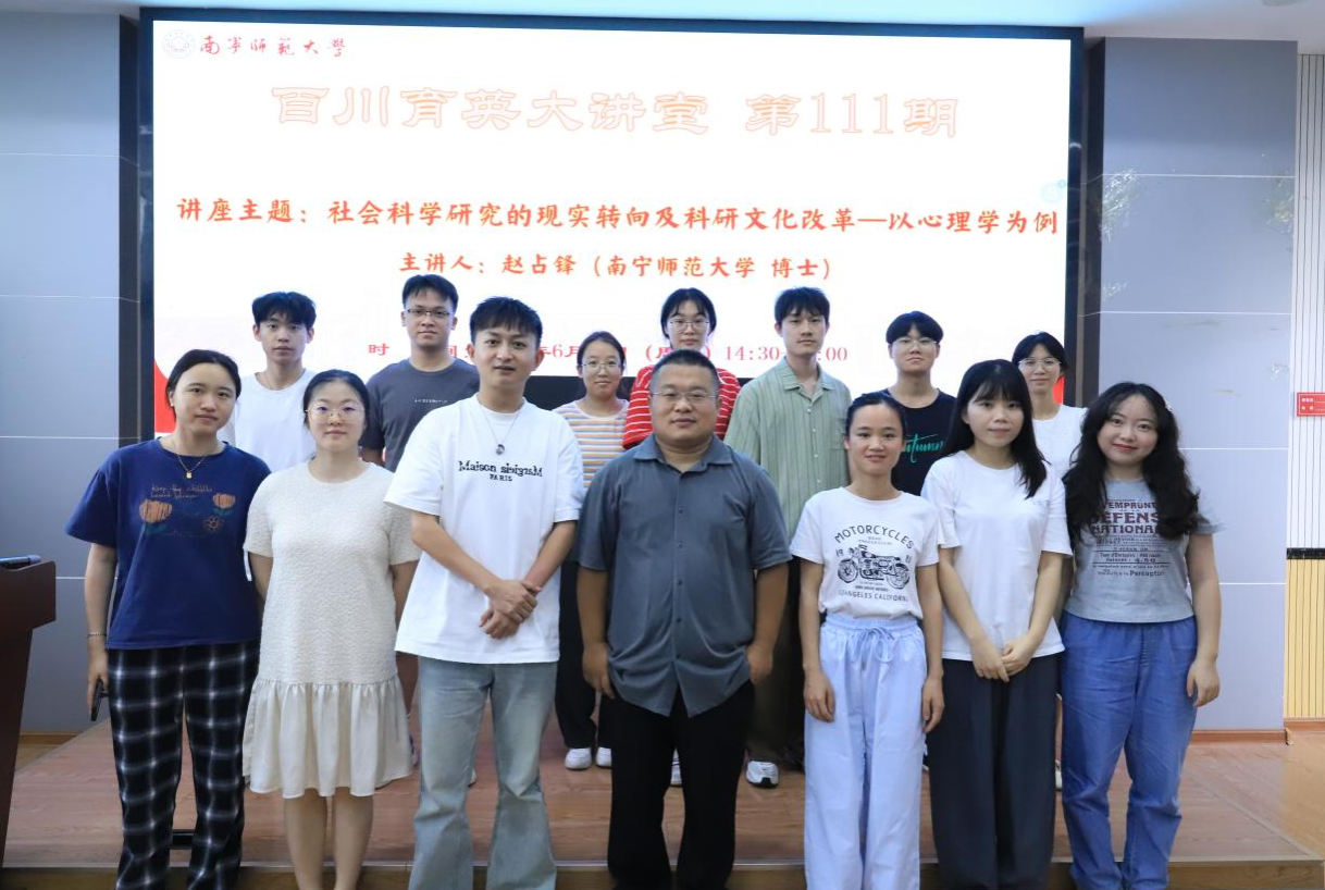 6月27日,为进一步拓宽师生学术视野,增进学术研究与现实的紧密关联,由beat365平台官方网站教育科学学院主办、广西教育现代化质量检测研究中心承办的《百川育英大讲堂》第111期讲座在五合校区理综楼1003室顺利举行。本次讲座以“社会科学研究的现实转向及科研文化改革——以心理学为例”为主题,由beat365平台官方网站教科院心理学系副系主任、副教授、硕士研究生导师赵占锋博士主讲。