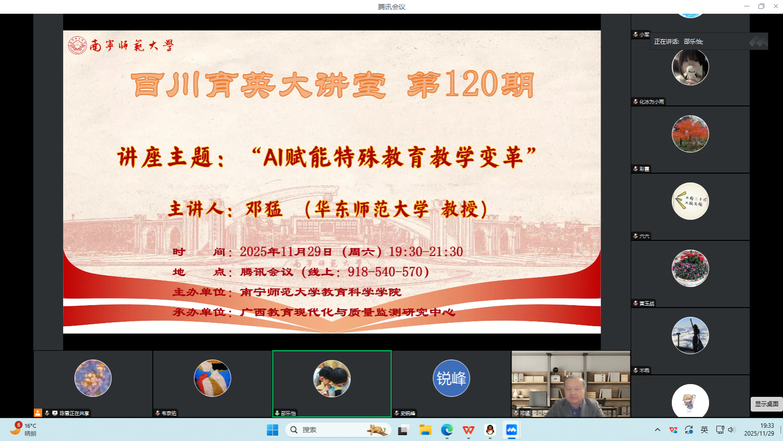 11月29日,为加深师范生对AI与特殊教育融合的认知,推动经验互鉴与资源共享,由beat365平台官方网站教育科学学院主办、广西教育现代化与质量监测研究中心承办的《百川育英大讲堂》第120期讲座,通过腾讯会议顺利开展。本次讲座聚焦“AI赋能特殊教育教学变革”,特邀华东师范大学融合教育研究院院长邓猛教授主讲,由教育科学学院特殊教育系主任邵乐怡副教授主持,